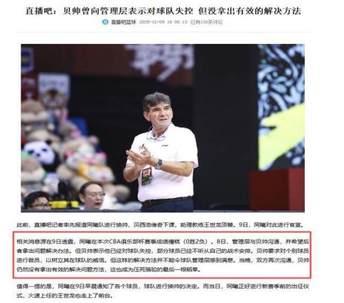 事情的真相真是如此吗?篮球资讯对此给出了最新的说法,没想到,并非家庭原因,也非战绩原因,而是“对球队失控”。按照篮球资讯在12月9日16点06分的报道,“相关消息源在9日透露,同曦在本次CBA俱乐部杯赛事成绩糟糕(0胜2负)。8日,管理层与贝帅沟通,并希望后者拿出问题解决办法。但贝帅表示他已经对球队失控,部分球员已经不听从自己的战术安排。贝帅要求对个别球员进行裁员,以树立其在球队的威信。但这样的解决方法并不能令球队管理层感到满意。当晚,双方再次沟通,贝帅仍然没有拿出有效的解决问题方法,这也成为压死骆驼的最后一根稻草。”