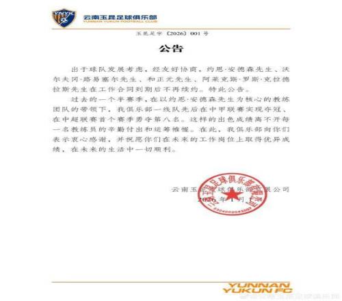 过去的一个半赛季,在以约恩·安德森先生为核心的教练团队的带领下,我俱乐部一线队先后在中甲联赛实现夺冠、在中超联赛首个赛季勇夺第八名。这样的出色成绩离不开每一名教练员的辛勤付出和运筹帷幄。在此,我俱乐部向你们表示衷心感谢,并祝愿你们在未来的工作岗位上取得优异成绩,在未来的生活中一切顺利。