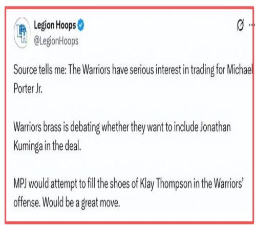 北京时间1月12日,NBA交易市场的热度随着2月6日交易截止日的临近持续攀升,而金州勇士队的一笔潜在交易传闻更是成为联盟热议的焦点。据美媒Legion Hoops报道,勇士队正对篮网前锋小迈克尔-波特展开猛烈追逐,管理层已就交易细节展开深入磋商。更关键的是,就在今天,一笔涉及勇士、国王与篮网的三方交易框架逐渐清晰,若能顺利达成,将大概率重塑西部竞争格局,为库里冲击生涯第五冠增添重磅砝码。