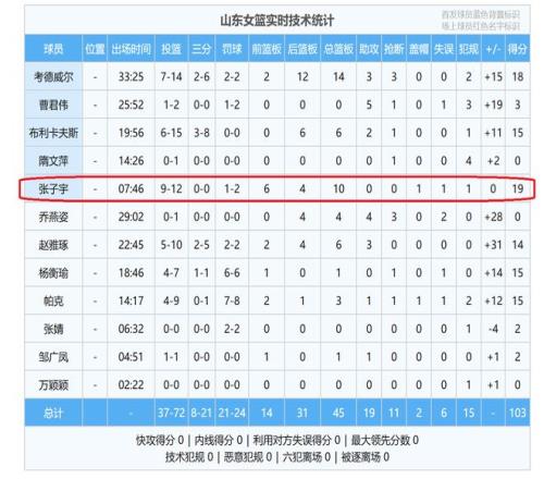 本场比赛,张子宇创造了3个WCBA个人职业生涯新高: