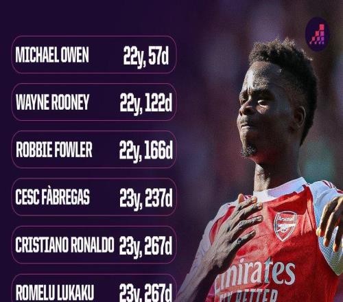 24岁29天,萨卡是英超参与100球第七年轻的球员