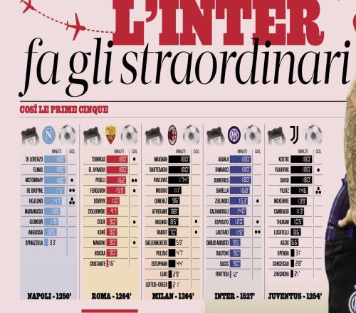 意甲五强球员国际比赛日出场时间:国米12人出场1527分钟最多 -